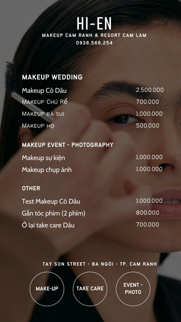 Chào đón mùa cưới và mùa du lịch nghỉ dưỡng, Hi-en Makeup chính thức triển khai dịch vụ trang điểm chuyên nghiệp tận nơi tại các Resort khu vực Cam Ranh và Cam Lâm. Nếu bạn đang lên kế hoạch cho một đám cưới lãng mạn bên bờ biển hay một buổi chụp ảnh kỷ niệm tại các khu nghỉ dưỡng cao cấp, hãy để Hi-en giúp bạn tỏa sáng một cách tự nhiên nhất.